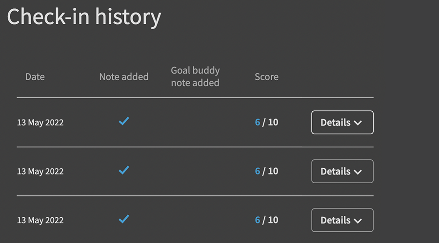 This feature enables members to sign up to goals that can be set by a platform owner who defines a set of goal statements / questions for members to answer at regular ‘check ins’. Members can record their progress and identify ways to make improvements with the help of their community.