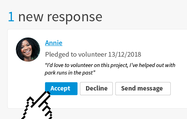 • Find the volunteer activity you wish to review, then use the 'actions' drop down on the right hand side to select 'manage responses'.